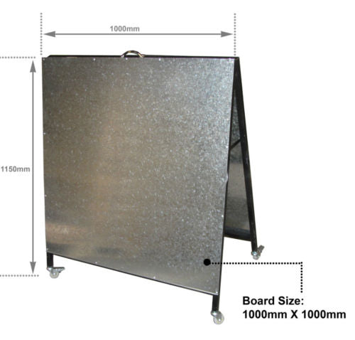 1150mm High when setup including top Handle. 1000mm X 1000mm galvanised boards on both sides,